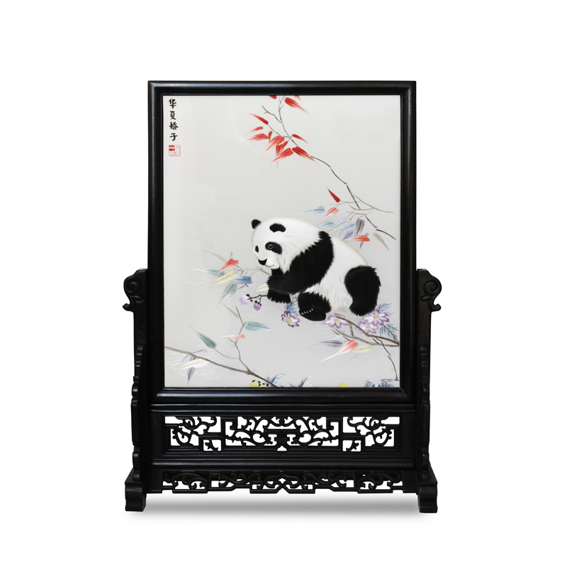 該臺屏由巴蜀一品高級工藝美術師朱曉娟手工制作而成。繡品展現出熊貓與繽紛花叢的和諧畫面。該作品主題鮮明、圖面靈動、意趣橫生,含義豐富,是饋贈收藏的佳品。