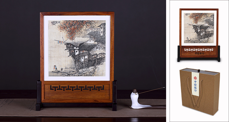 在川渝人的記憶中,滾滾而過的江水、船帆、遠山的黛影和近處山坡上高低不平、重重疊疊的吊腳樓在人們心目中留下難以磨滅的印象。本品選用了150目夏布,特邀著名畫家姚敘章作畫,畫面古樸靈動,雅而不僵。外框和底座選用了名貴實木酸枝木與紫光檀,與夏布搭配,更加古色古香。本品可在底座和包裝盒上進行定制,既不影響作品本身的美感,又能很好地體現企業的專屬性。